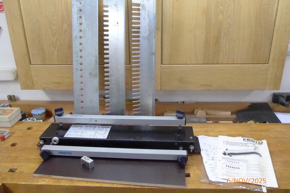 zum Verkauf steht eine komplette VS 500 von Festo mit allen 3 Schablonen also zum Dübeln und Lochreihen, zum Fingerzinken und zum Anfertigen von halbverdeckten Schwalben, dabei sind auch der wichtige Distanzring zum Fingerzinken, der Höhenmesser für den Gratnutfräser auf Tiefe einzustellen und die Anleistung, letzte hat mal etwas Kaffee abbekommen...siehe Bilder