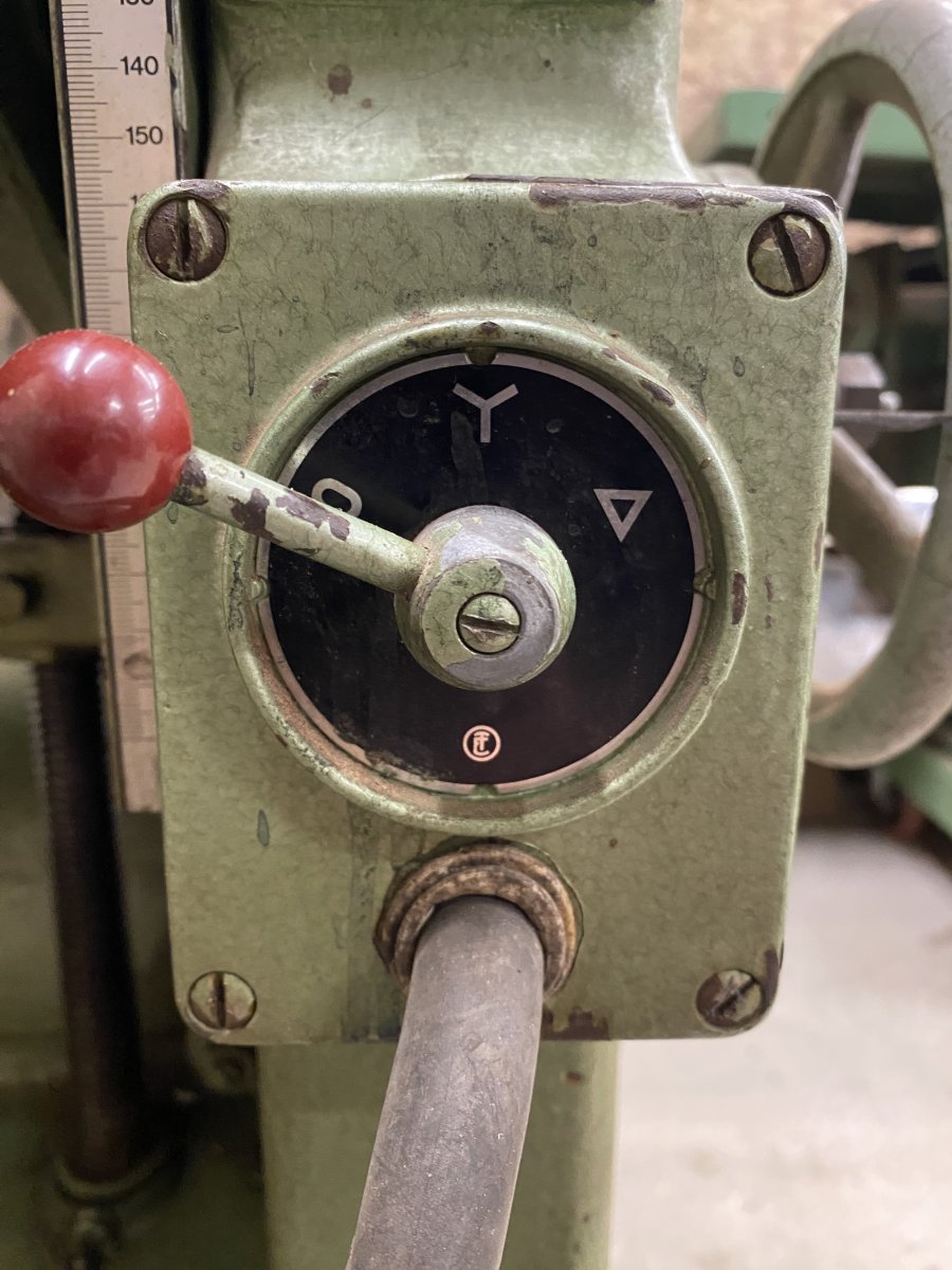 Mit Dickentischarretierung über Fußhebel (sehr genial).