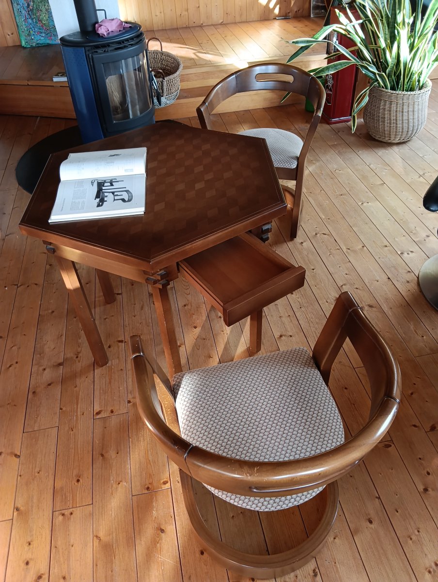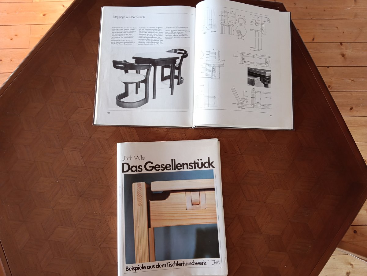 Auch das gute Stück muss jetzt Platz machen. Tisch und Stühle sind aus massiver Buche gefertigt. Die Platte ist aus unendlich vielen Rauten zusammen gefügt, die aus Limba Furnier bestehen. Würde mich sehr, sehr freuen wenn die Garnitur ein neues Zuhause bekommt. Dabei ist natürlich das Buch indem das Gesellenstück vorgestellt wird.