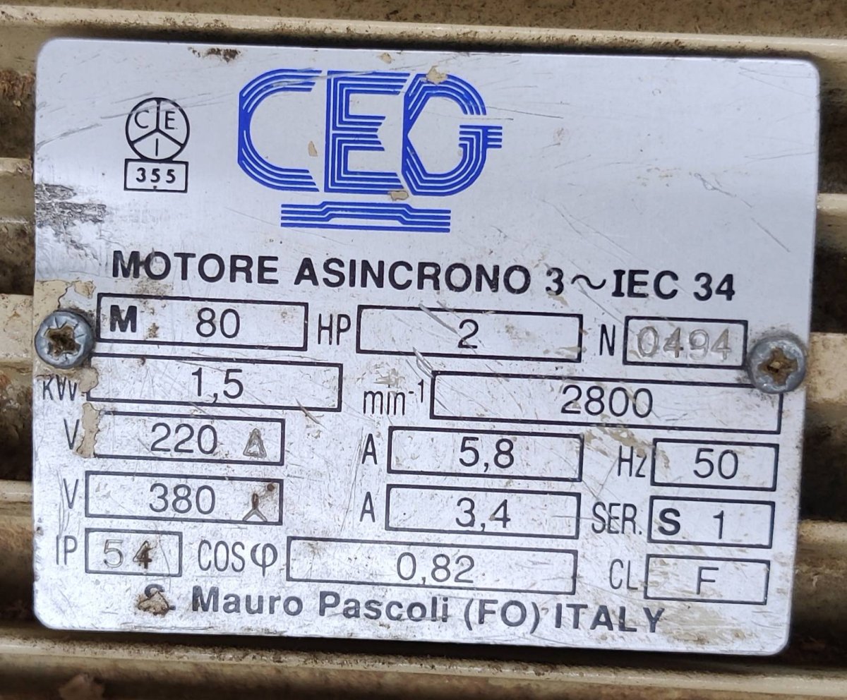 380V Drehstrommotor mit 1,5 KW Leistung und Leistungsschutzschalter.