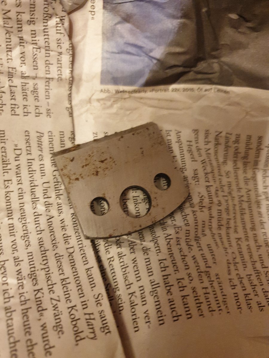 Es ist alles dabei, was auf den Fotos zu sehen ist. Die Anleitung habe ich digital, kann sie aber auch ausgedruckt beilegen, wenn gewünscht. Der Zustand ist wie auf den Fotos zu sehen. Der montierte Messersatz und der schon genutzte haben etwas Flugrost (siehe Fotos).
