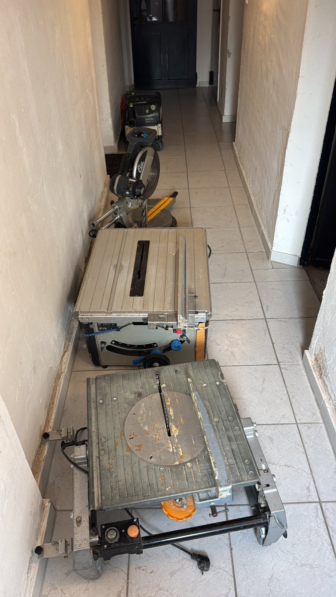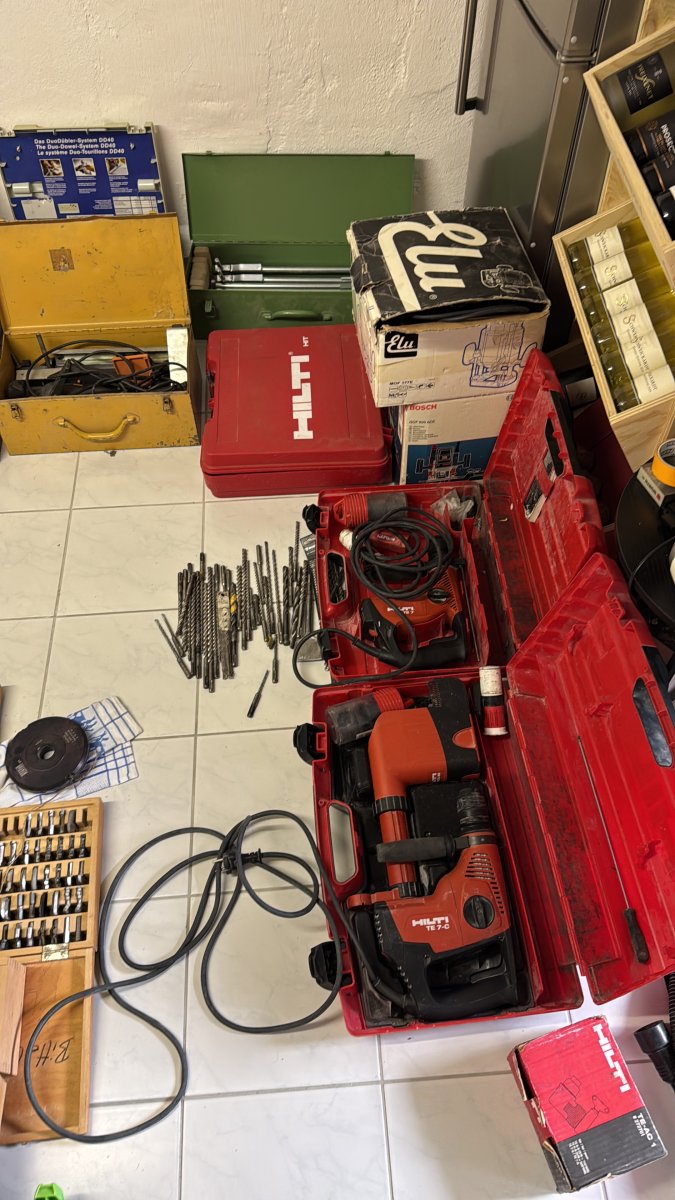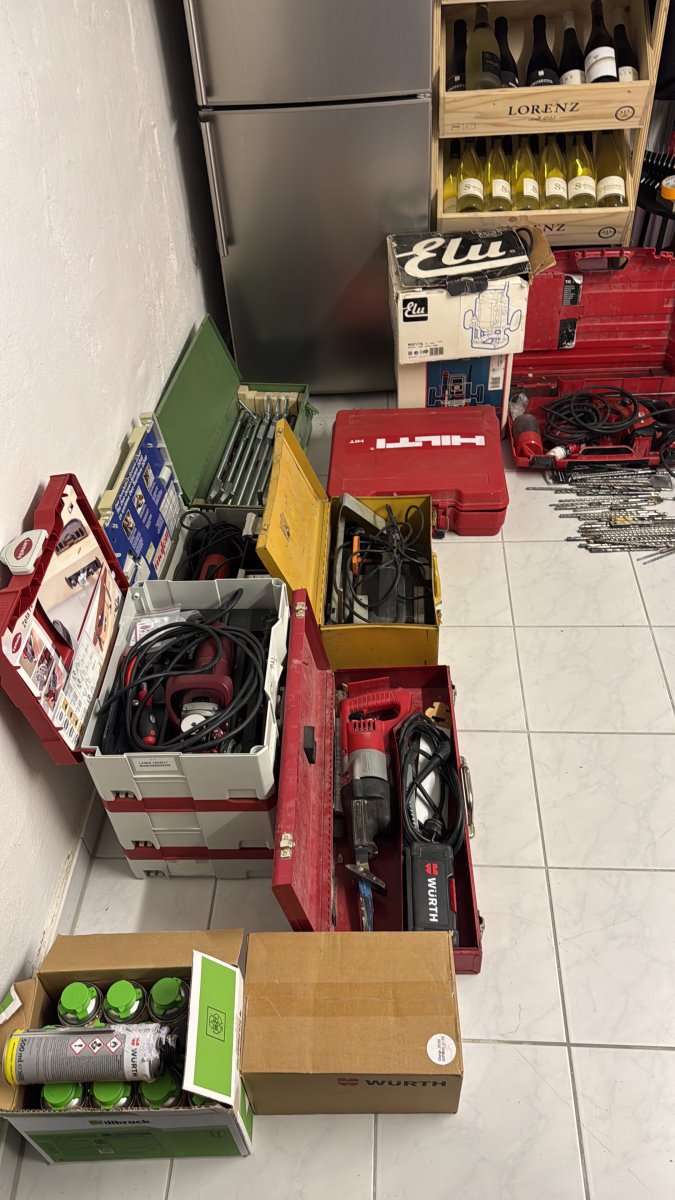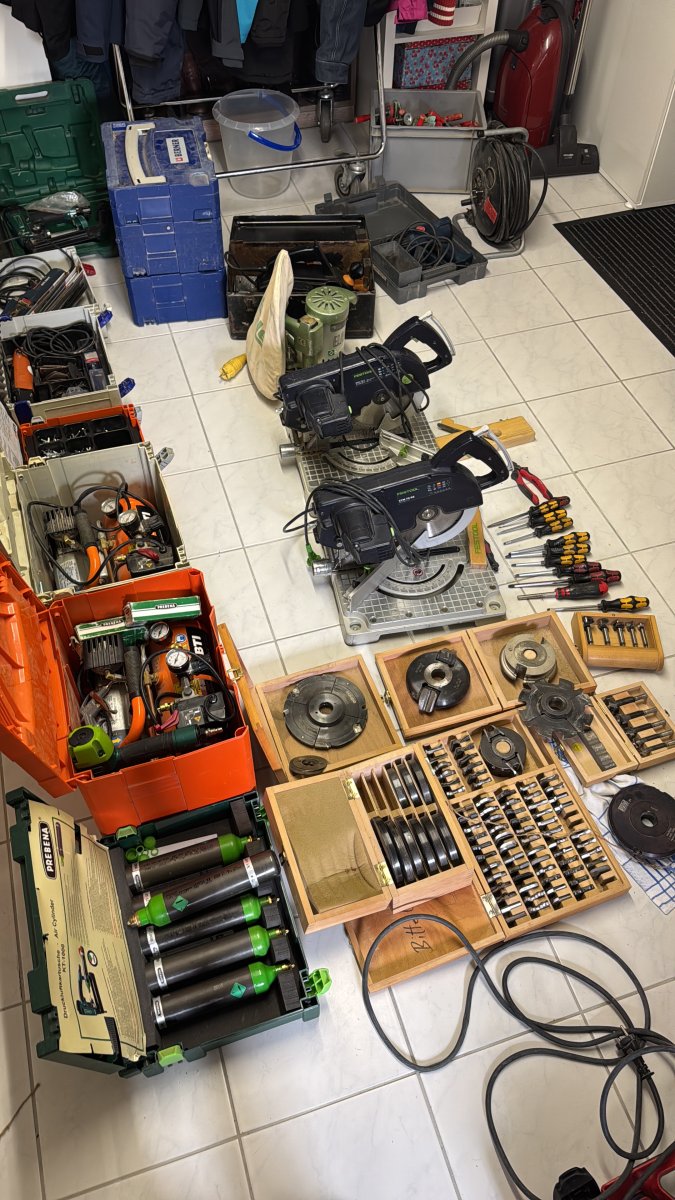 elektrische Wasserwaagen, Oberfräsen, Stemmhämmer, Bohrmaschinen, Multischneider, Tischkreissägen, Kappsägen, Stichsägen, Handkreissägen, Sägeblätter, Tischfräsen diverse Aufsätze ,sowie verschiedene Schleifmaschinen und weiteres Montagezubehör und Werkzeuge