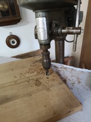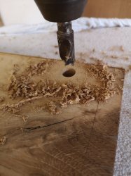 Aus diesem Grund habe ich mit den empfohlenem 16 mm Bohrer vorgebohrt und anschließend mit einem Senker die oberste Schicht eingesenkt. Dadurch platzte die oberste Schicht nicht mehr ab.