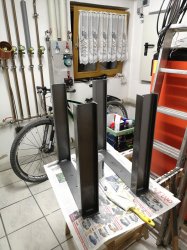 Als Füße habe ich mir IPE80-Stahlträger ausgesucht. Zwei der Füße werden jeweils durch ein 80x5-er Flacheisen verbunden. Zuerst wurden je 4 Durchgangslöcher mit einem Durchmesser von 10,5 mm in die beiden Flachstahl-Abschnitte gebort. Anschließend wurden die Einzelteile zu einem befreundeten Metallbauer gegeben und dort exakt geschweißt.