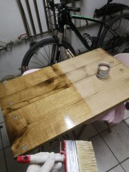 Die Tischplatte habe ich mit Osmo Hartwachsöl im Farbton Natur/Farblos in Seidenmatt behandelt, da ich den ursprünglichen Farbton so wenig wie möglich verfälschen wollte. Auf der Unterseite hab ich es einmal und auf der Oberseite in Summe dreimal aufgetragen.